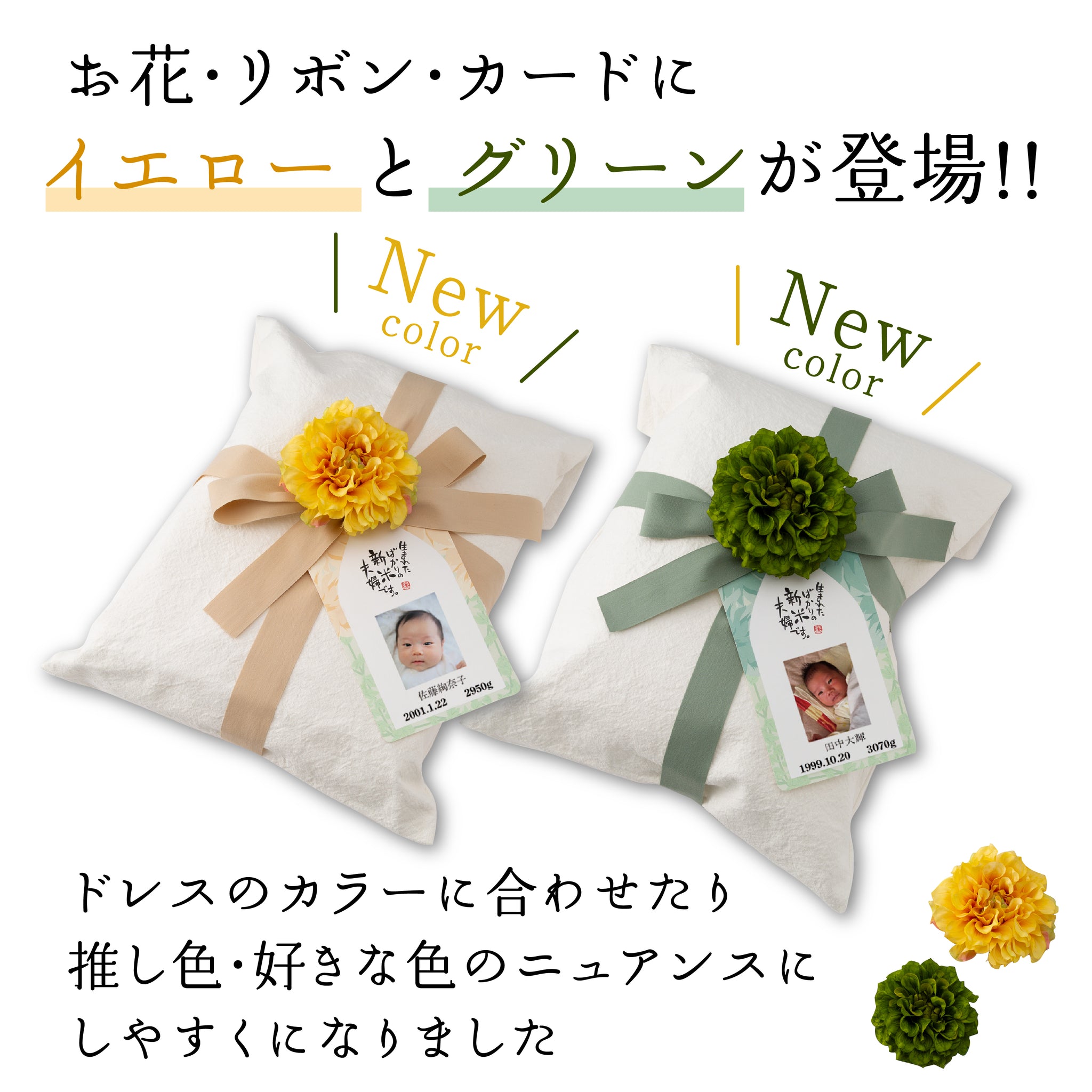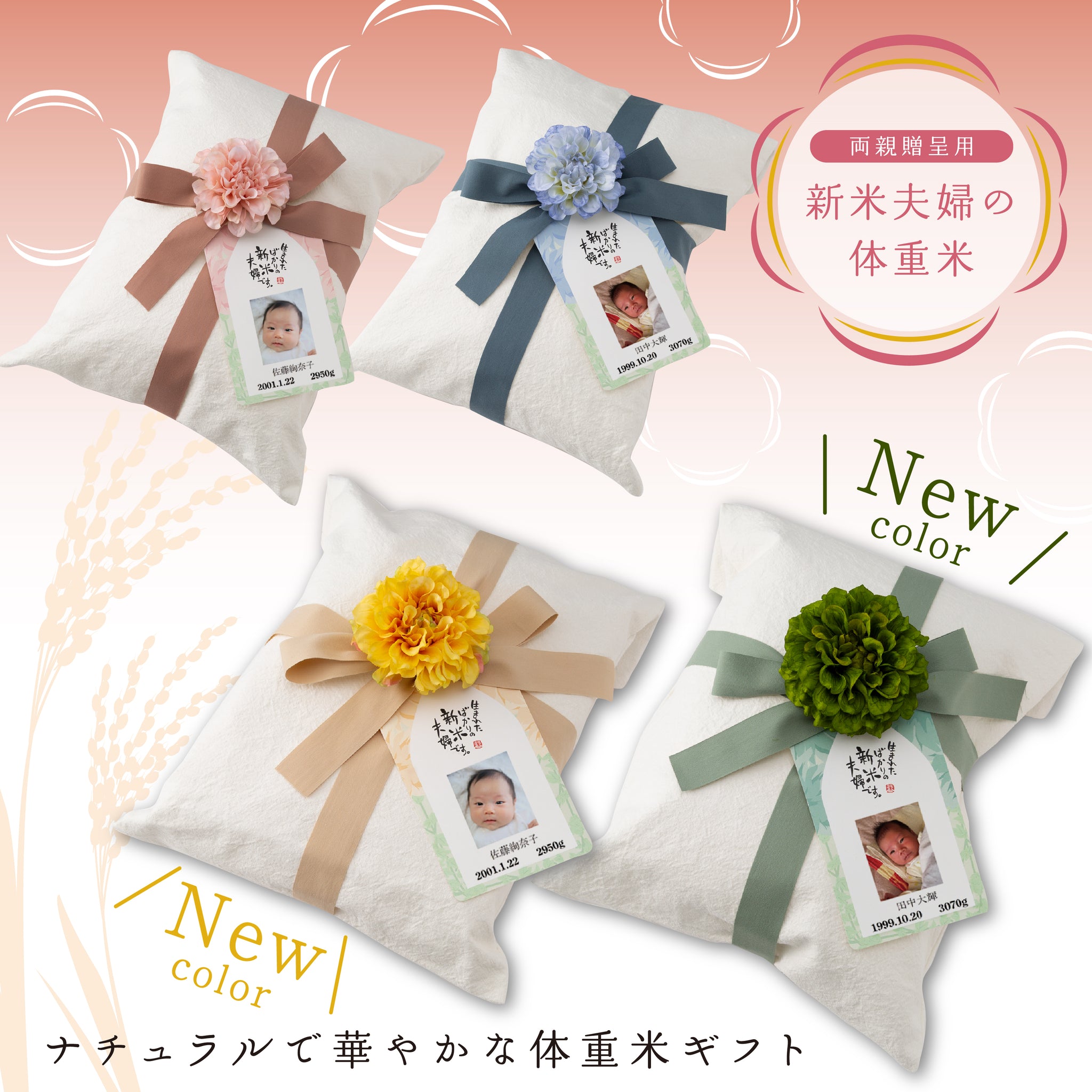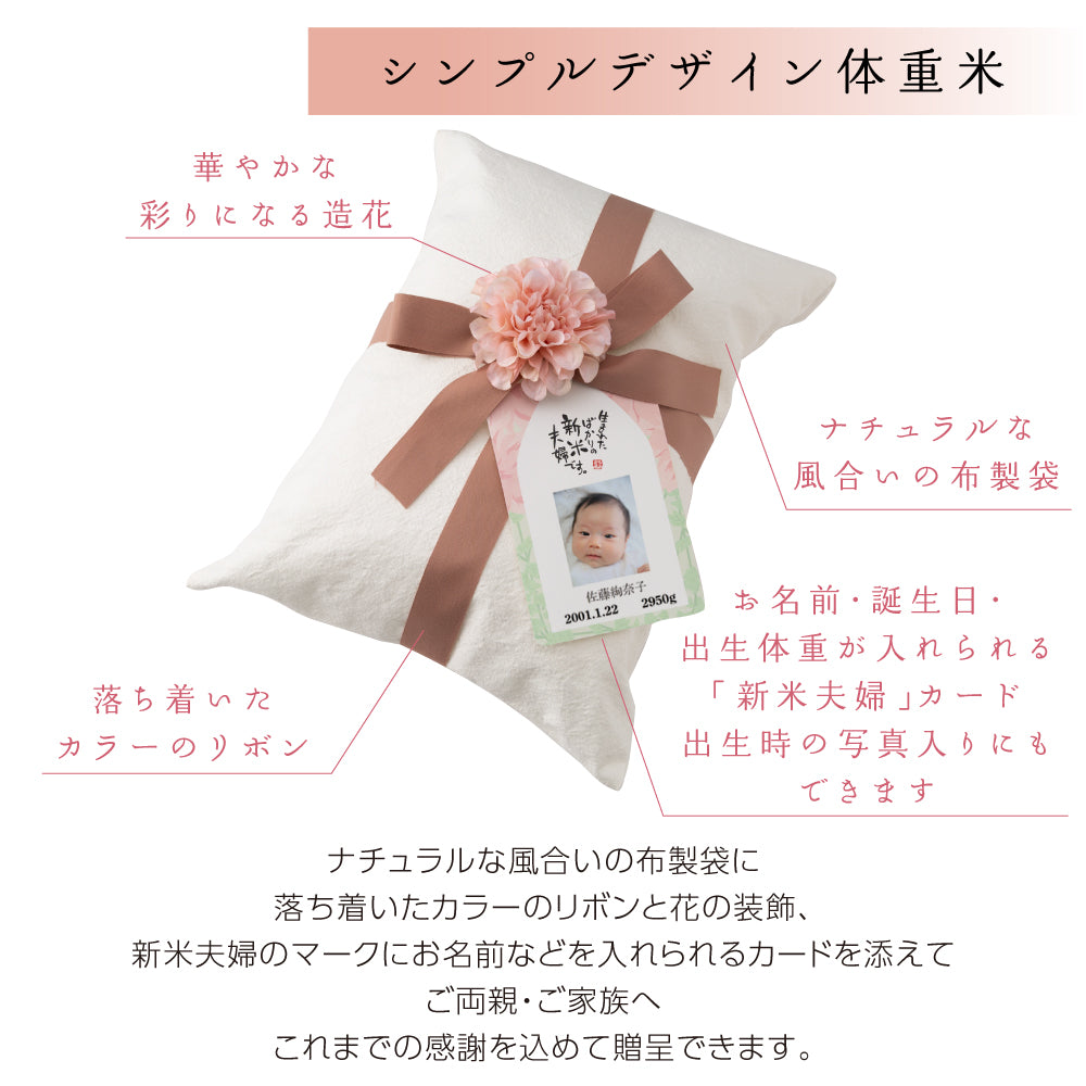 華やかな装飾とナチュラルな雰囲気の袋入り体重米で、出生時と同じ重さのお米を贈ります。