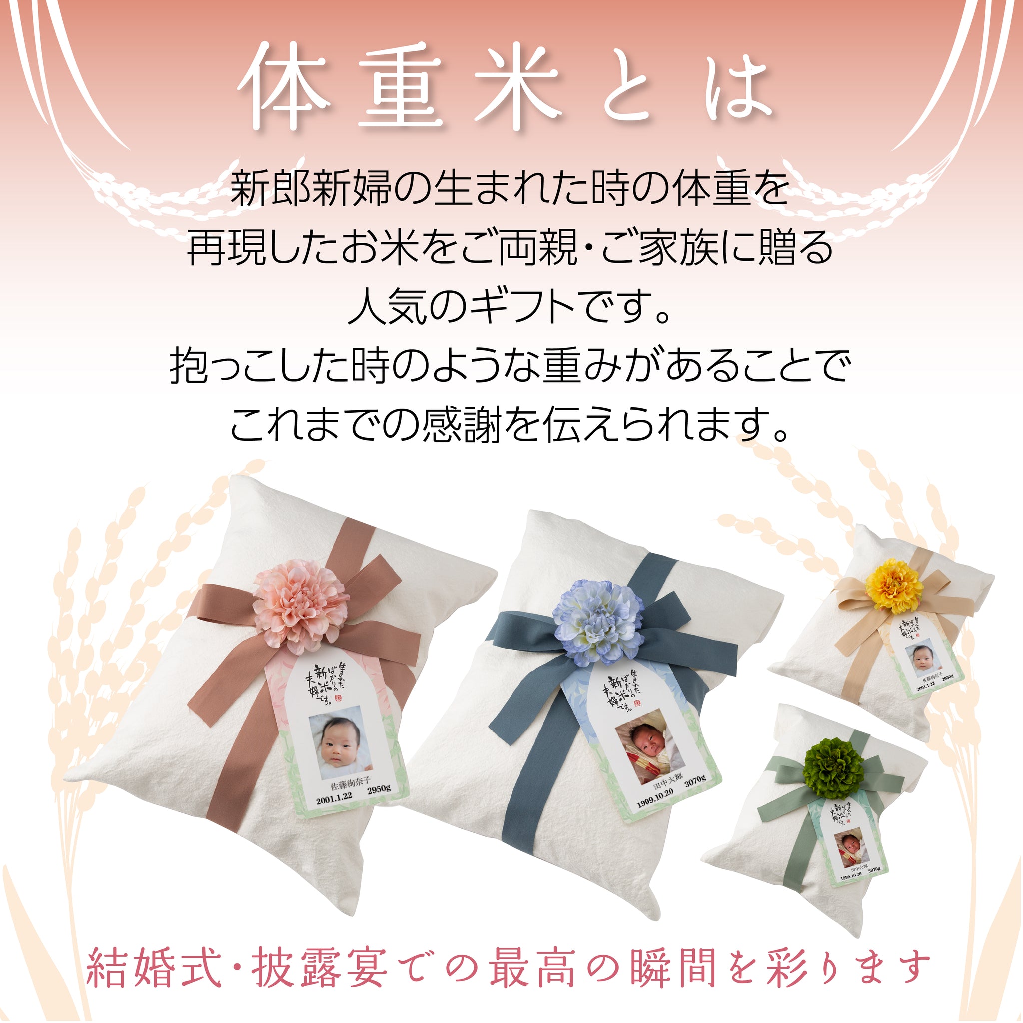 印象的な体重米ギフトで結婚式・披露宴を彩り、サプライズとともにご両親・ご家族に感謝の気持ちを伝えられるギフトです。