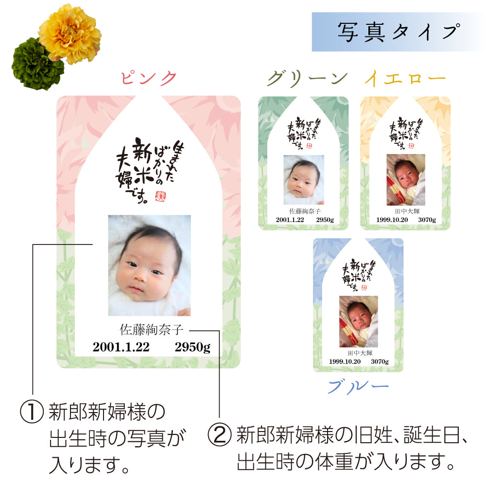 こちらは、新郎新婦のお名前と出生時の写真・旧姓・誕生日・出生体重が入れられる写真タイプの新米夫婦カードの販売ページです。※文字タイプはこちらよりご購入ください。
