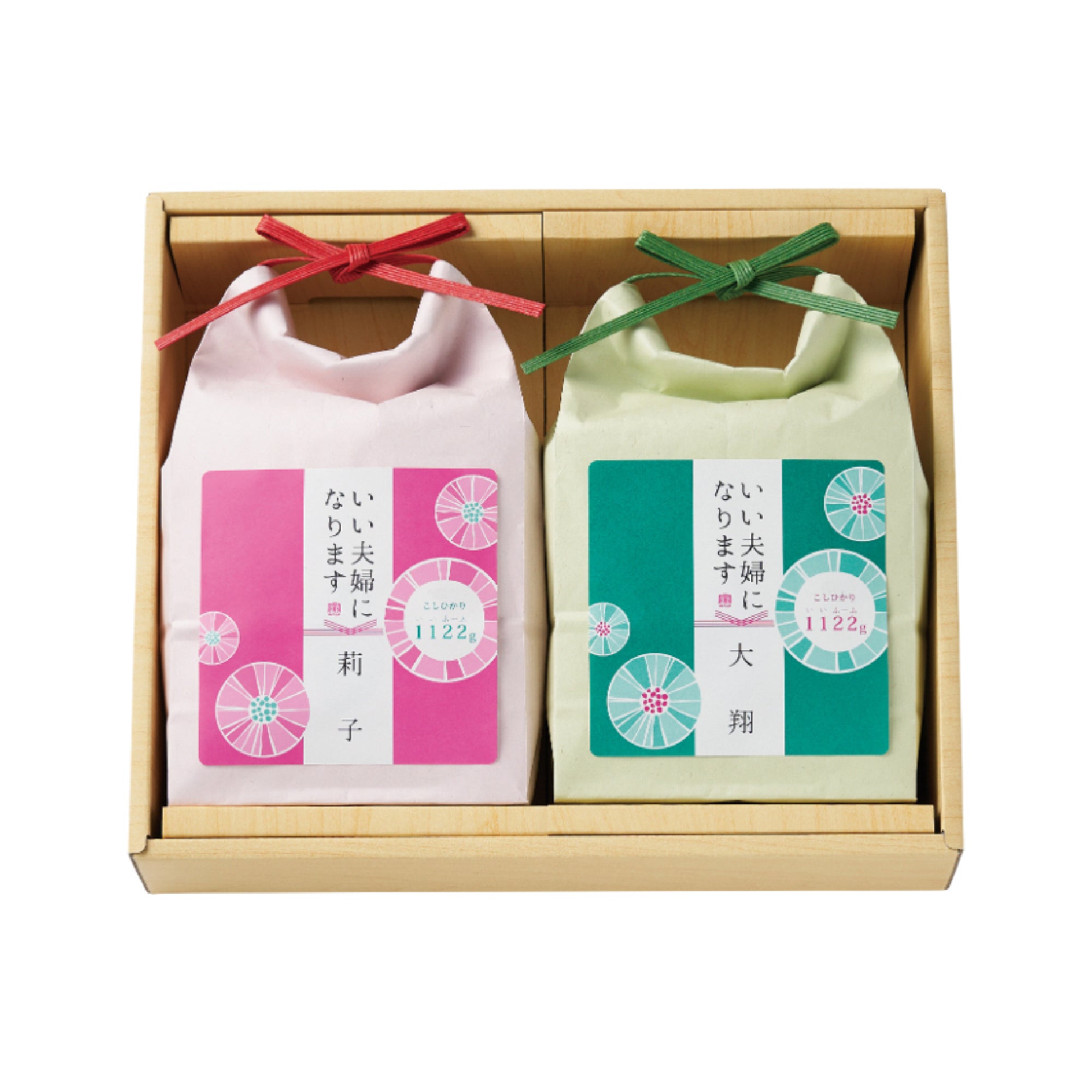 お二人のお名前を米袋に記載して「いい夫婦になります」と宣言するようなギフト。