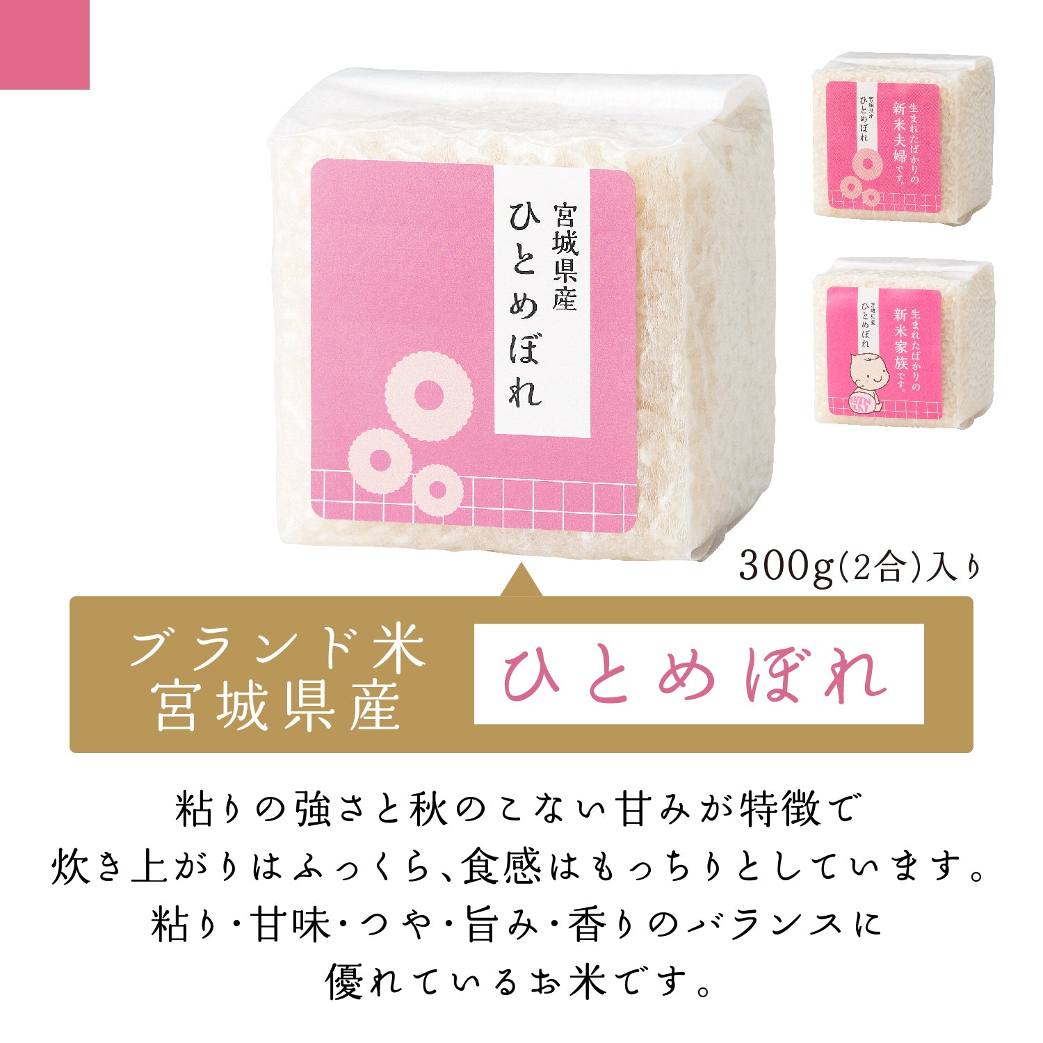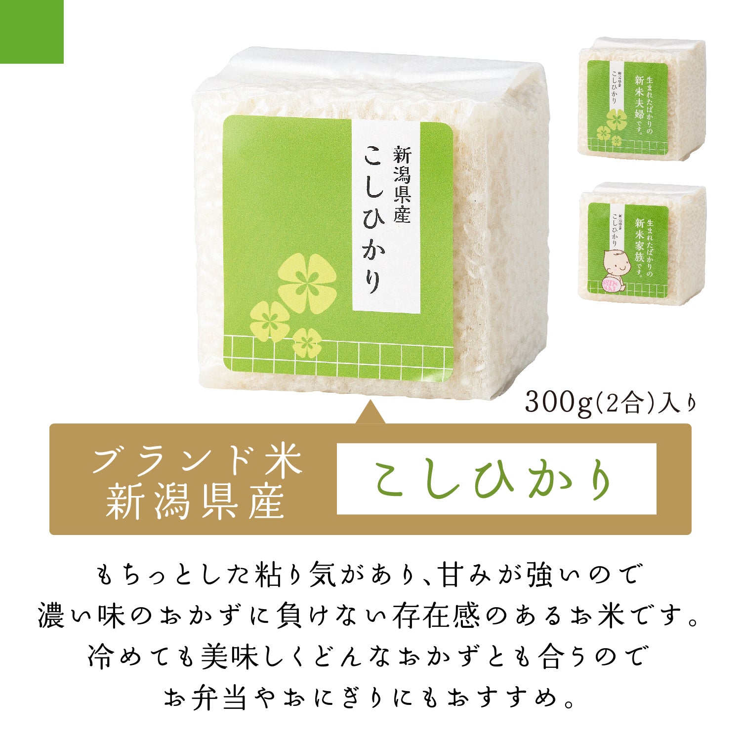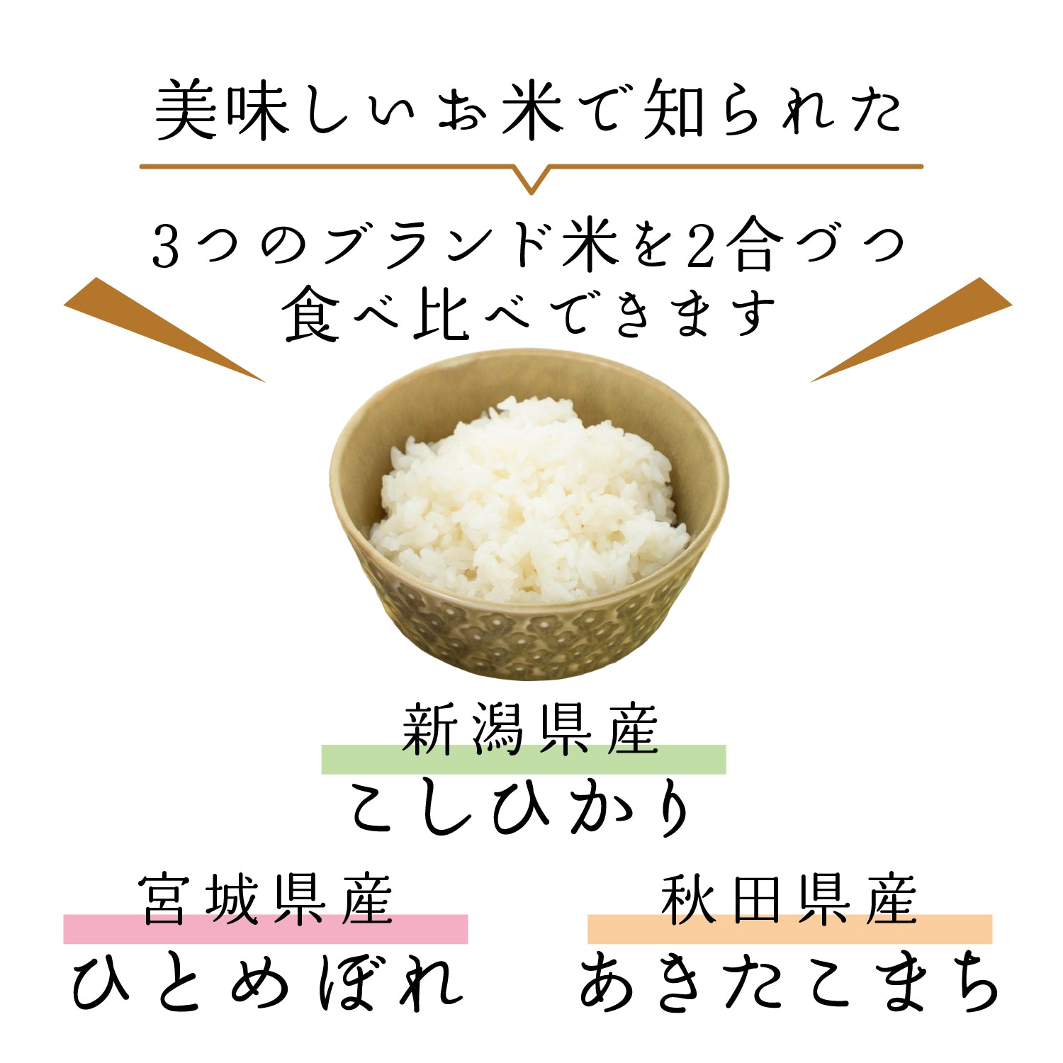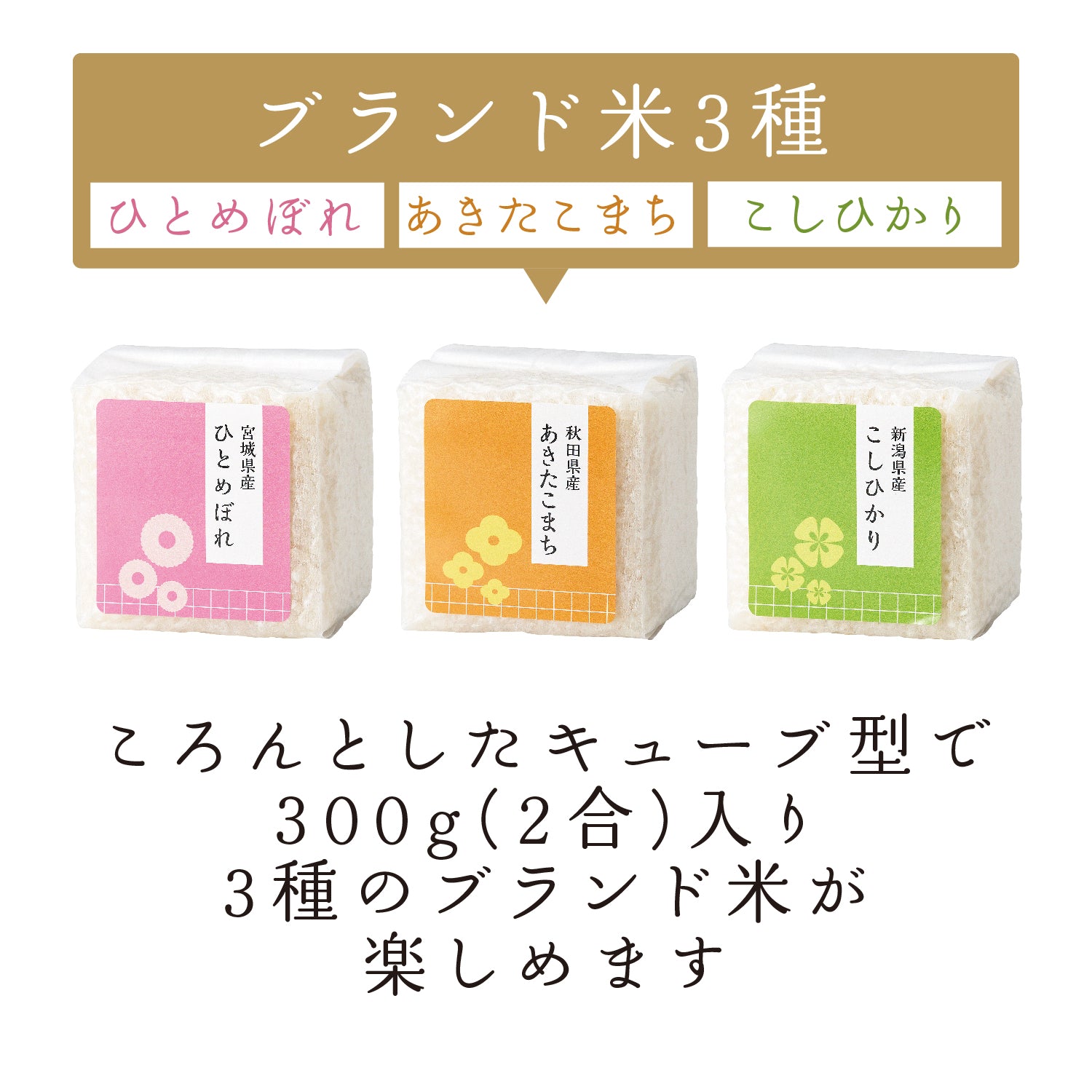 ブランド米新潟県産こしひかり・宮城県産ひとめぼれ・秋田県産あきたこまち1個入りで、食べ比べできます。