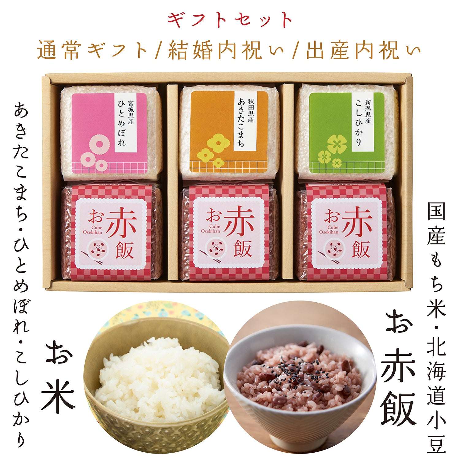 お米もお赤飯も少量ずつのキューブ型なので、お好きなタイミングで炊いて食べられます。少しずつ楽しめるギフトセットです。