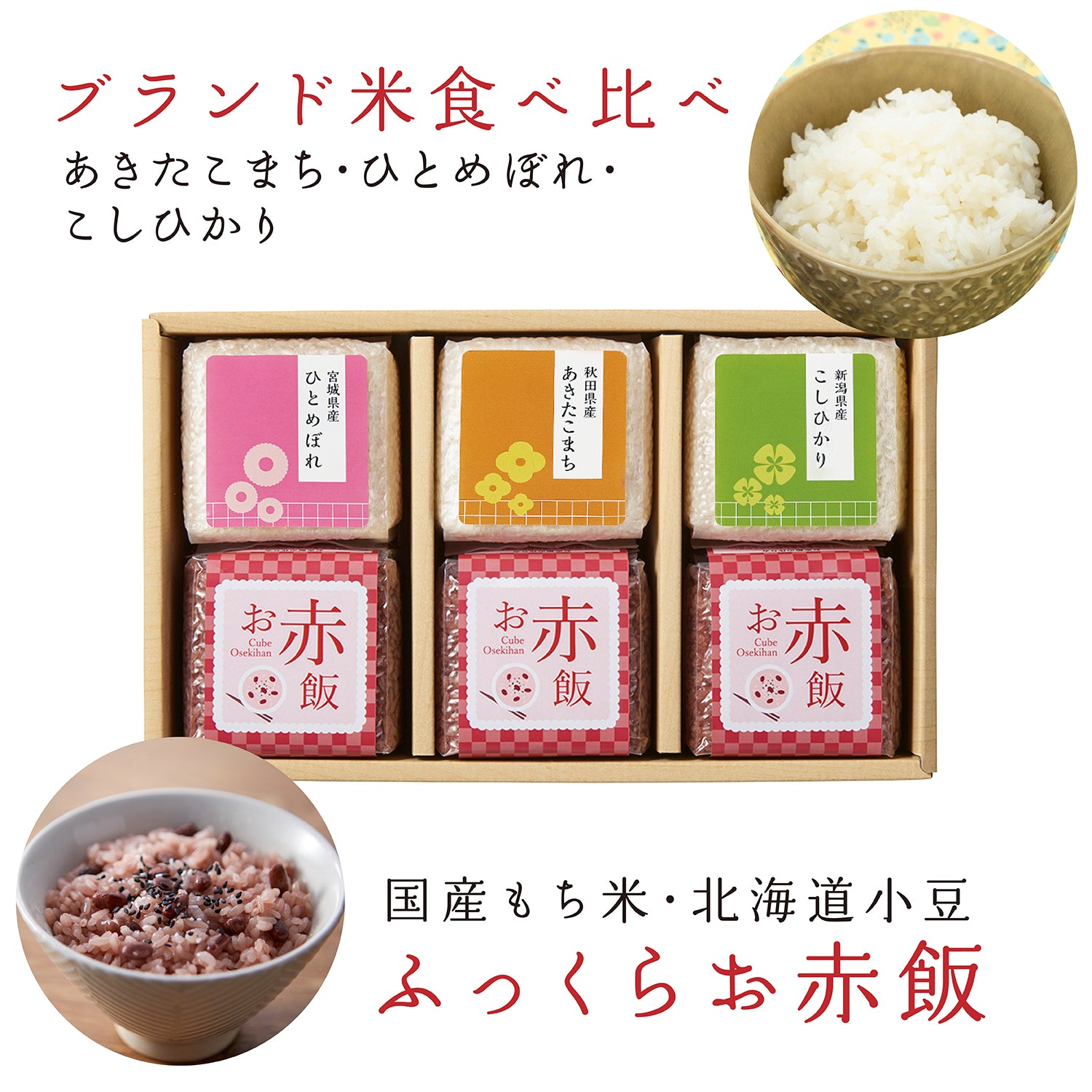 ブランド米ひとめぼれ・あきたこまち・こしひかりとお赤飯3個セット