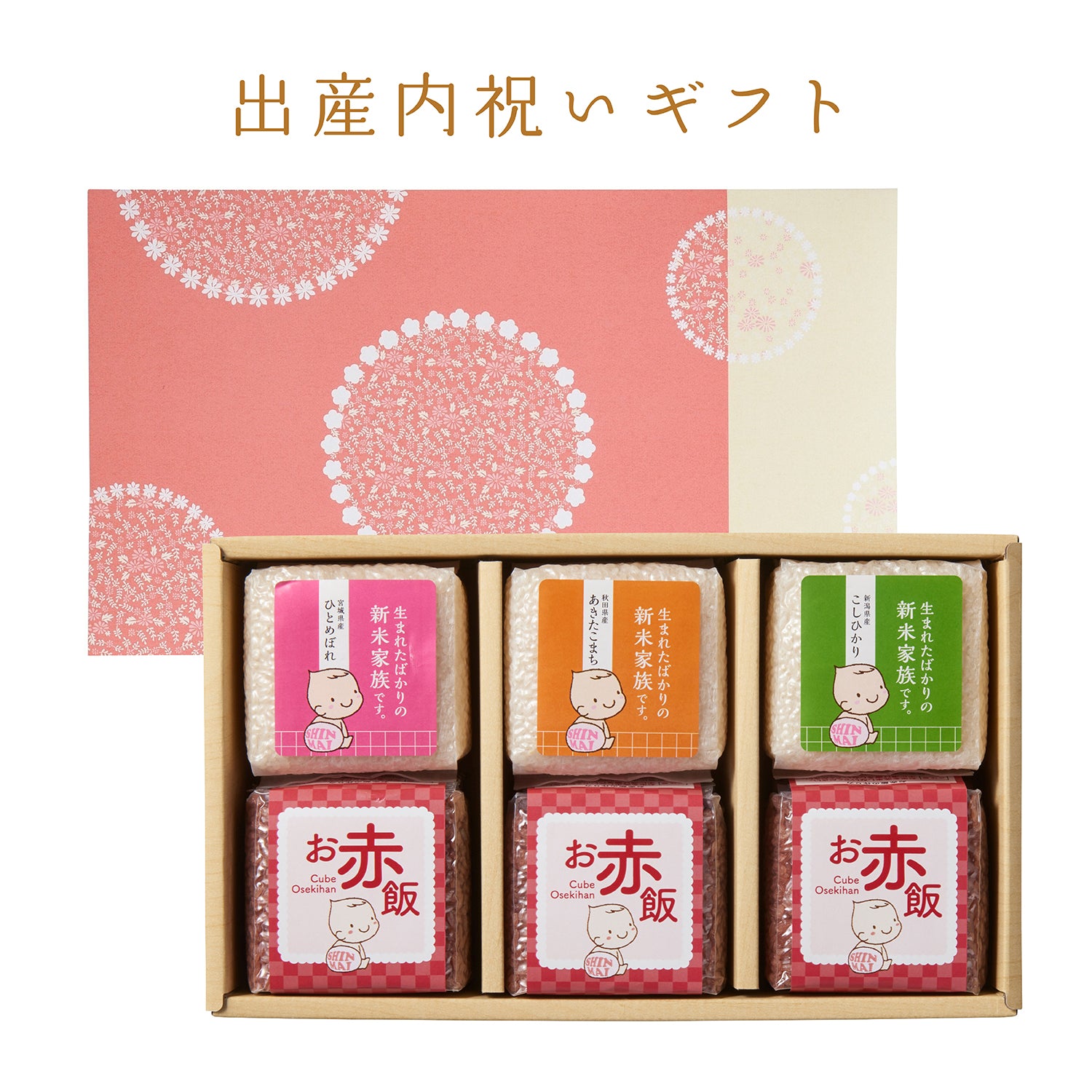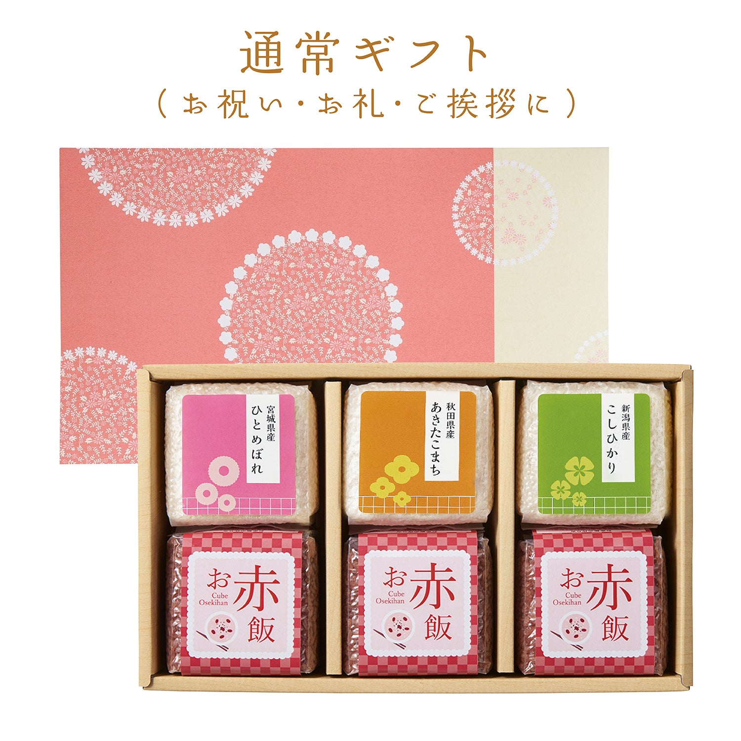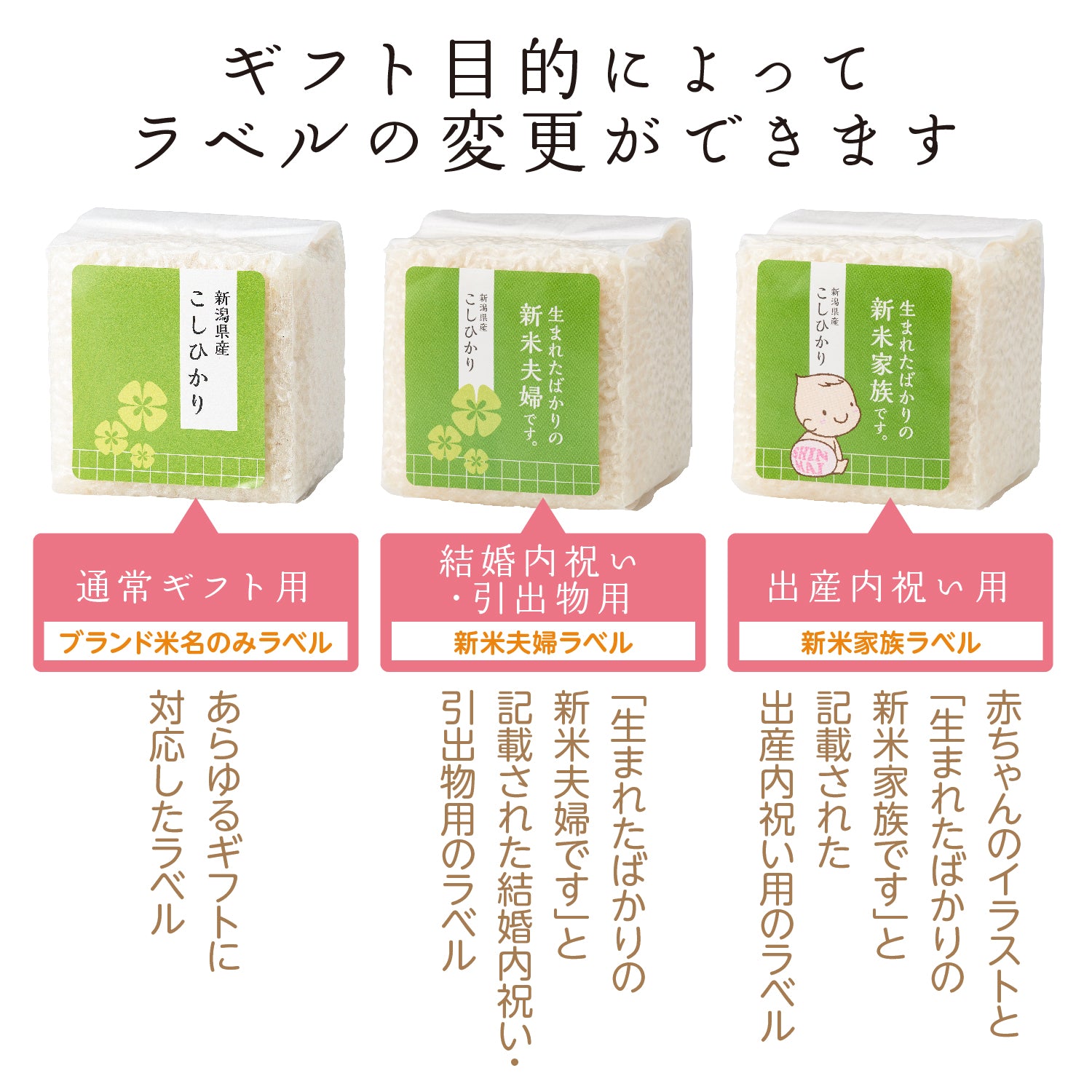 ギフト目的によって、お米・お赤飯のラベルが変わります。